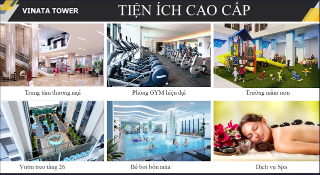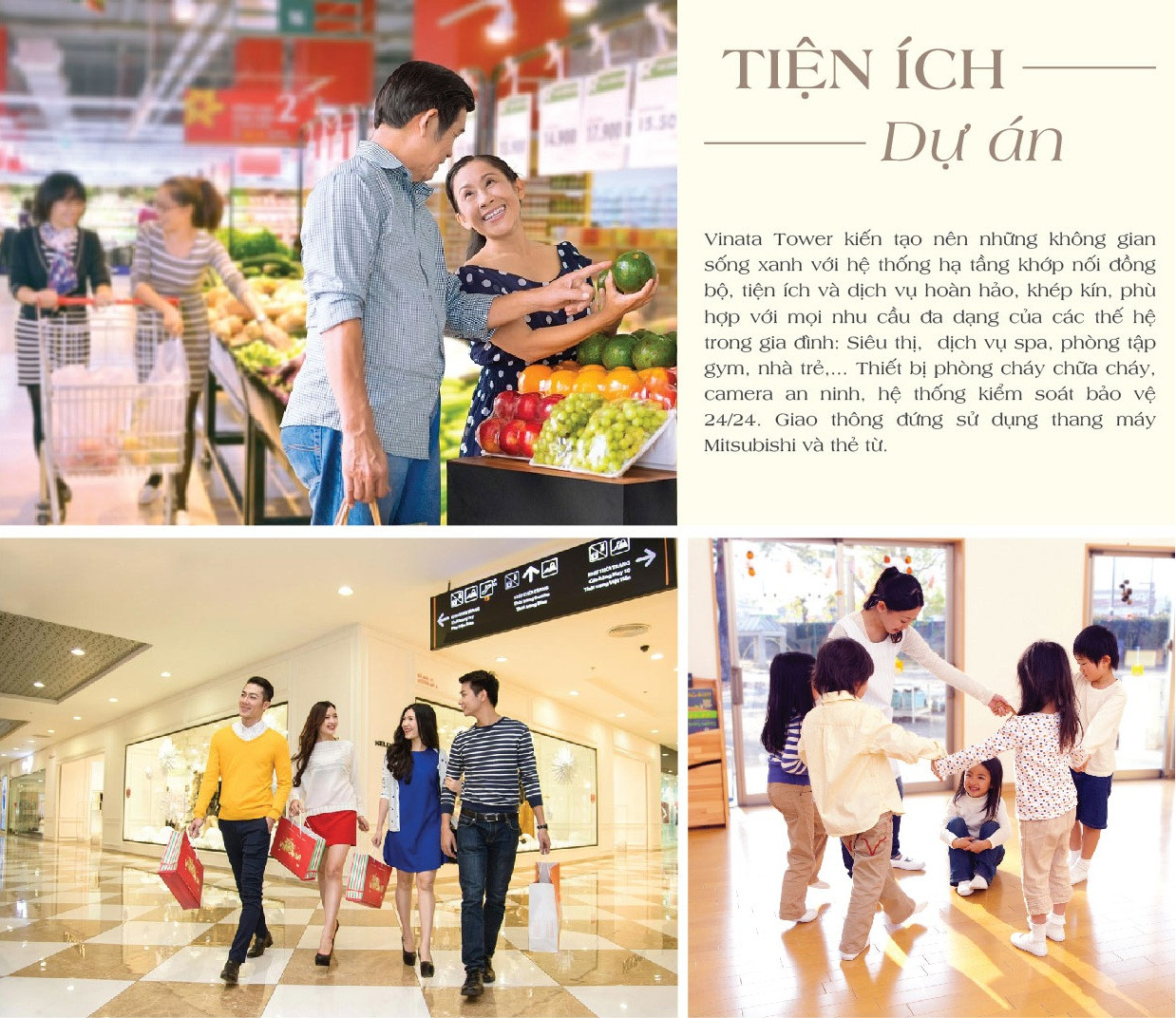 - Tổ hợp căn hộ Vinata Tower được xây dựng hướng tới một cuộc sống hiện đại tiện nghi sống cho cư dân trang bị với nhiều tiện ích hàng đầu của một khu chung cư cao cấp như: Trung tâm thương mại, Khu vui chơi giải trí, Phòng tập Gym, Fitness & Yoga, Trường mầm non, Bể bơi bốn mùa, Nhà hàng, Khu đọc sách,…