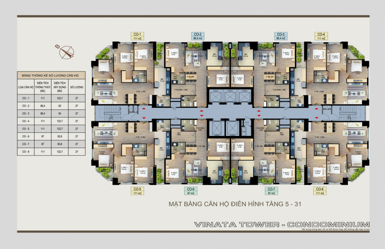 Một mặt sàn Chung cư Vinata Tower gồm có 8 căn hộ với các hộ 2 phòng ngủ và 3 phòng ngủ tương ứng với các loại diện tích từ 86.6 m2 – 113 m2 (thông thủy):